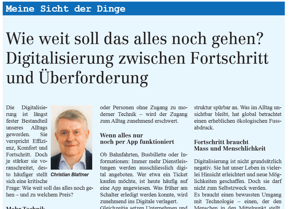 Digitalisierung ist nicht grundsätzlich negativ. Sie hat unser Leben in vielerlei Hinsicht erleichtert und neue Möglichkeiten geschaffen. Doch sie darf nicht zum Selbstzweck werden.